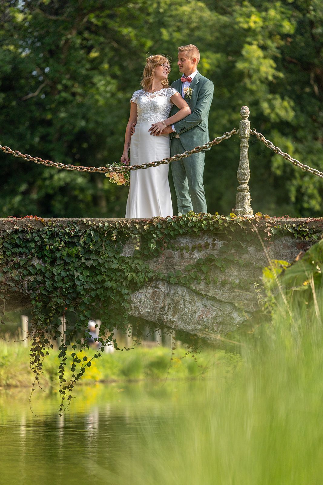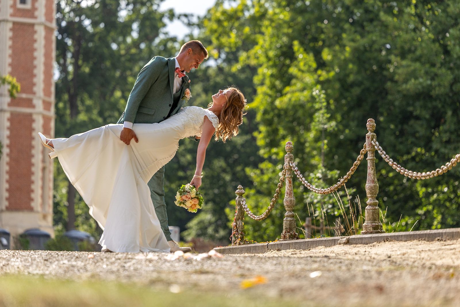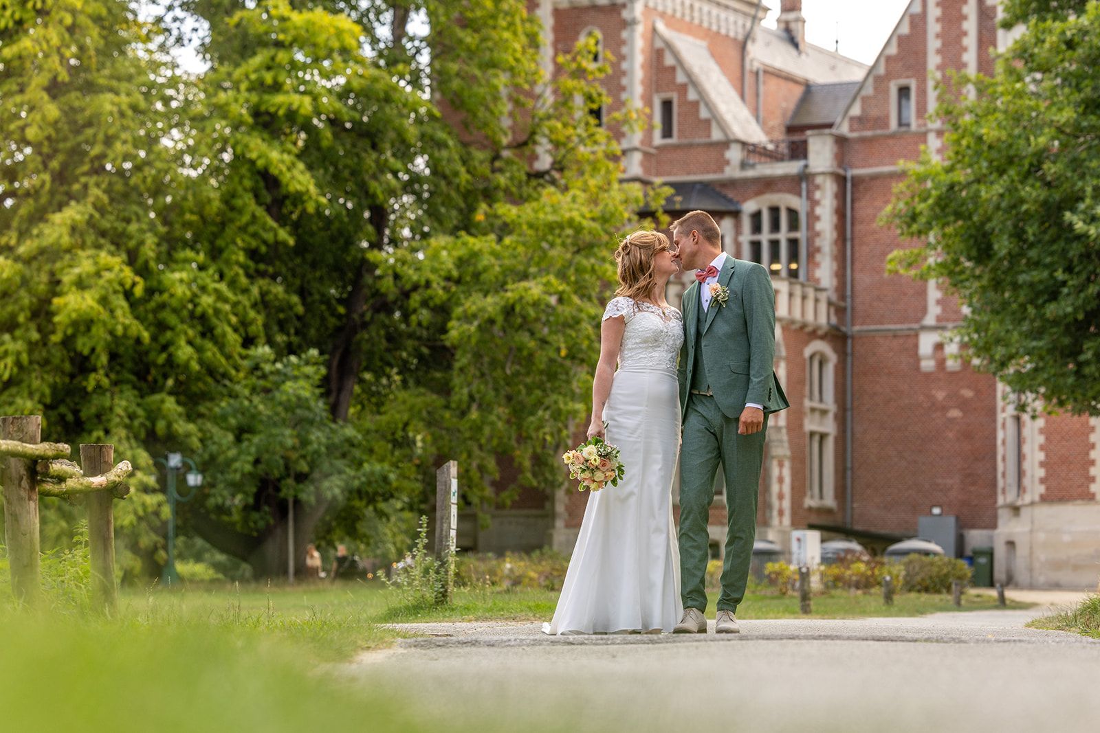 Na de ceremonie trokken we naar het Kasteel van Aartrijke voor de trouwshoot. De historische charme, het groen en de rustige omgeving boden het perfecte decor voor tijdloze en elegante foto’s. Het koppel straalde, en hun natuurlijke connectie zorgde voor beelden vol gevoel en spontaniteit.
