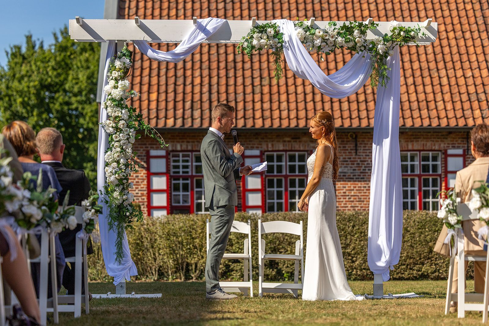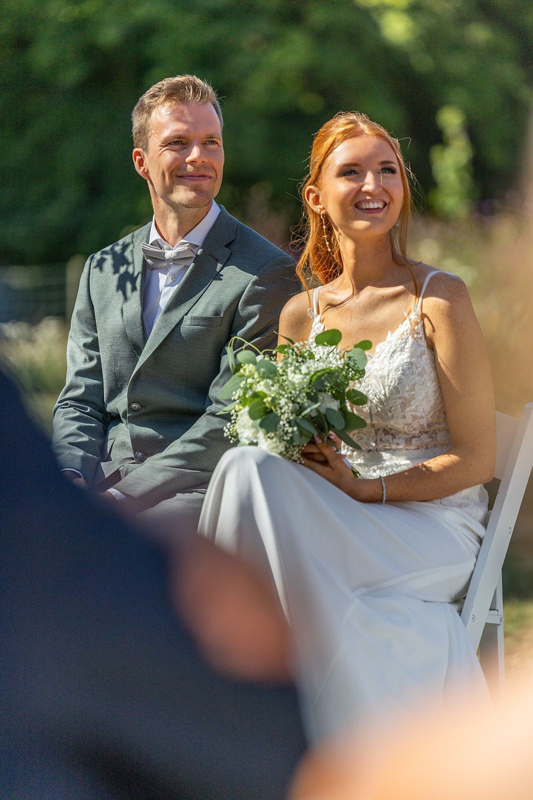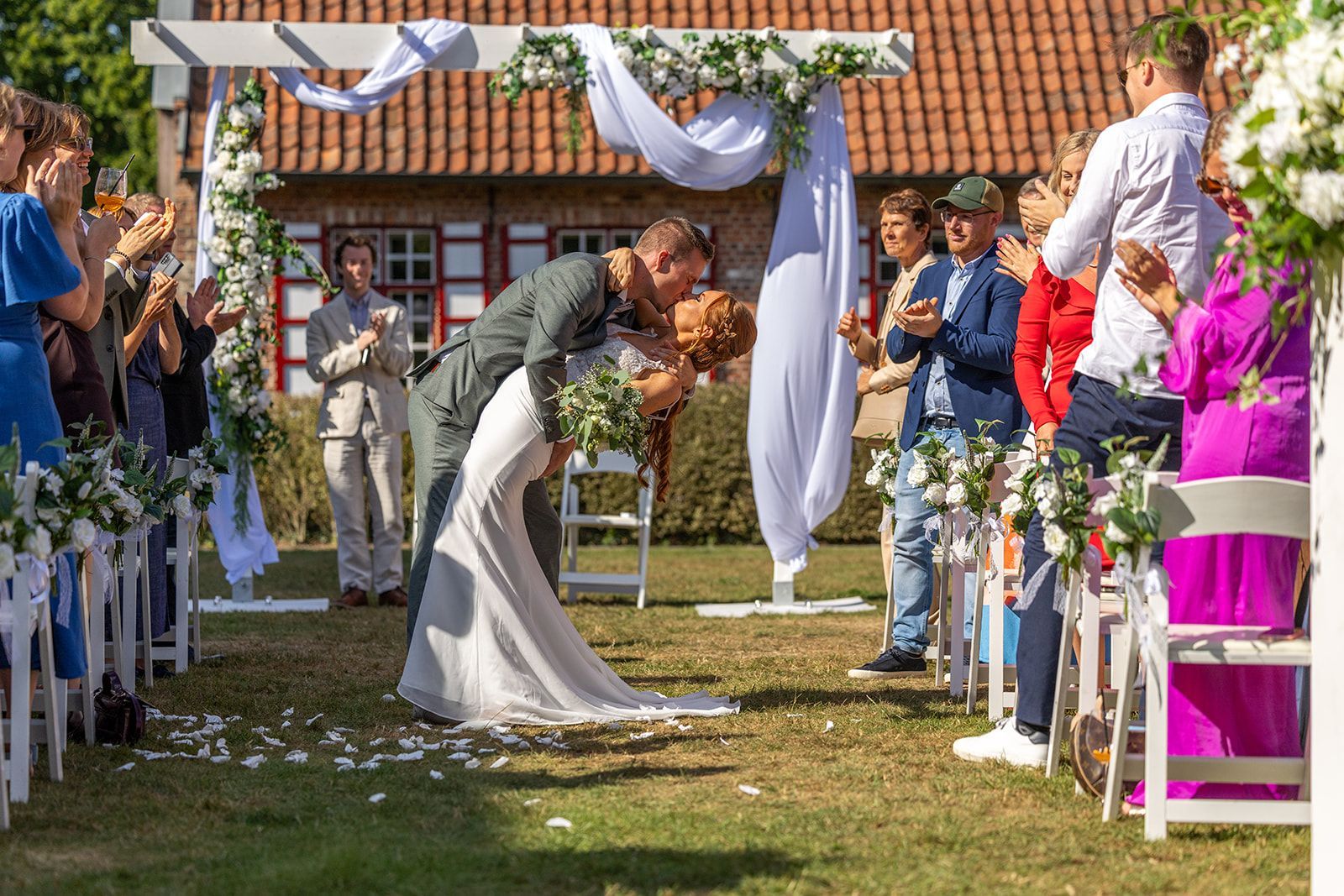 Na de shoot vond de ceremonie plaats in dezelfde prachtige locatie. De warme setting, stijlvolle aankleding en persoonlijke sfeer maakten de ceremonie bijzonder betekenisvol. Als huwelijksfotograaf leg ik niet alleen de grote momenten vast, maar ook de kleine details: een aanraking, een traan van vreugde of een uitbundige lach.