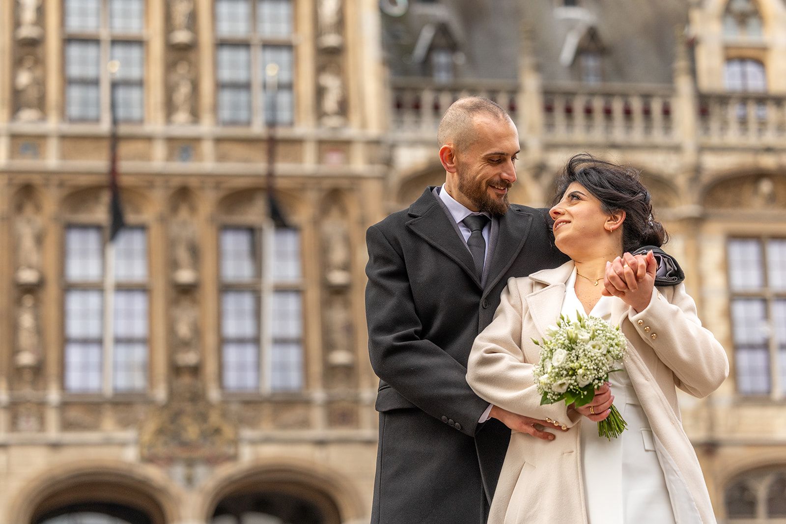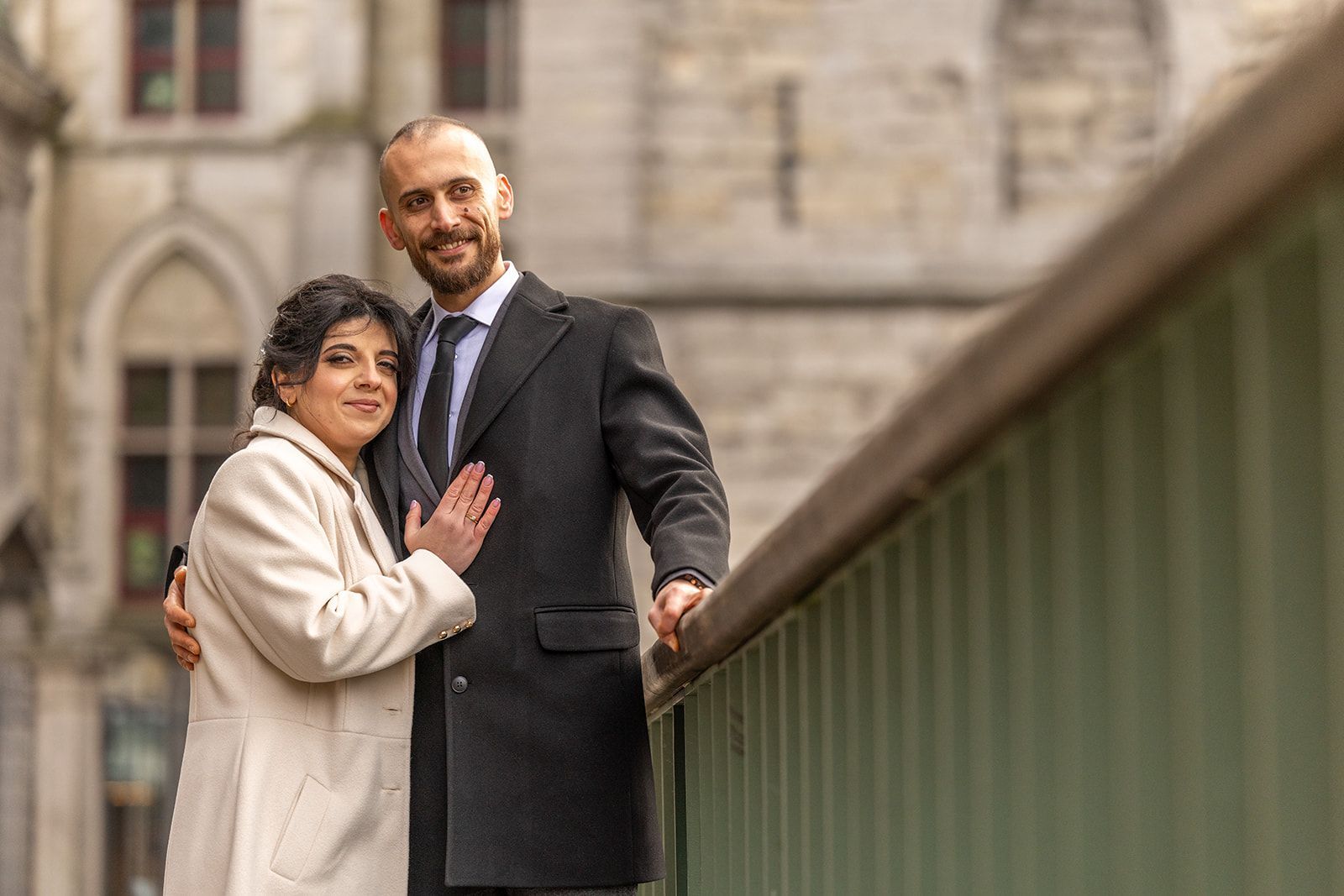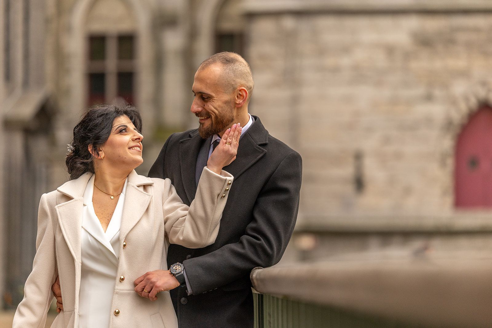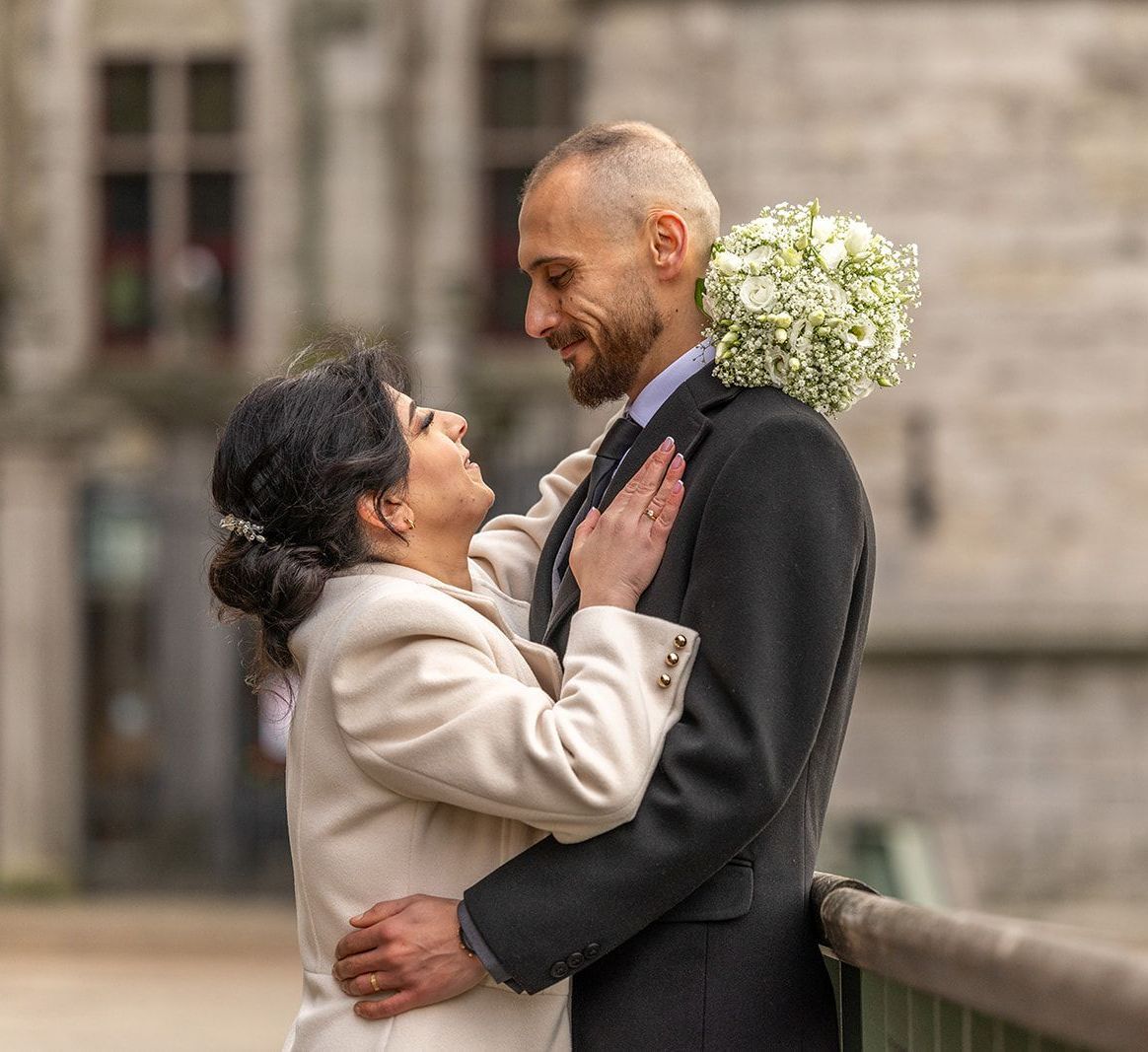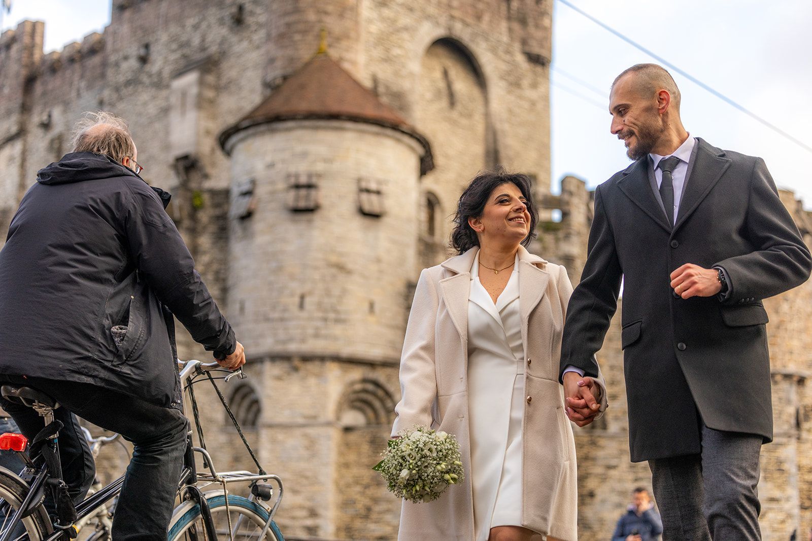 Het koppel koos voor een eenvoudige ceremonie in het historische centrum van Gent. De romantische straatjes, pittoreske pleinen en indrukwekkende architectuur zorgden voor een prachtig decor. Na de ceremonie maakten we een ontspannen wandeling langs de Graslei en het Patershol, waar ik spontane en liefdevolle momenten kon vastleggen.